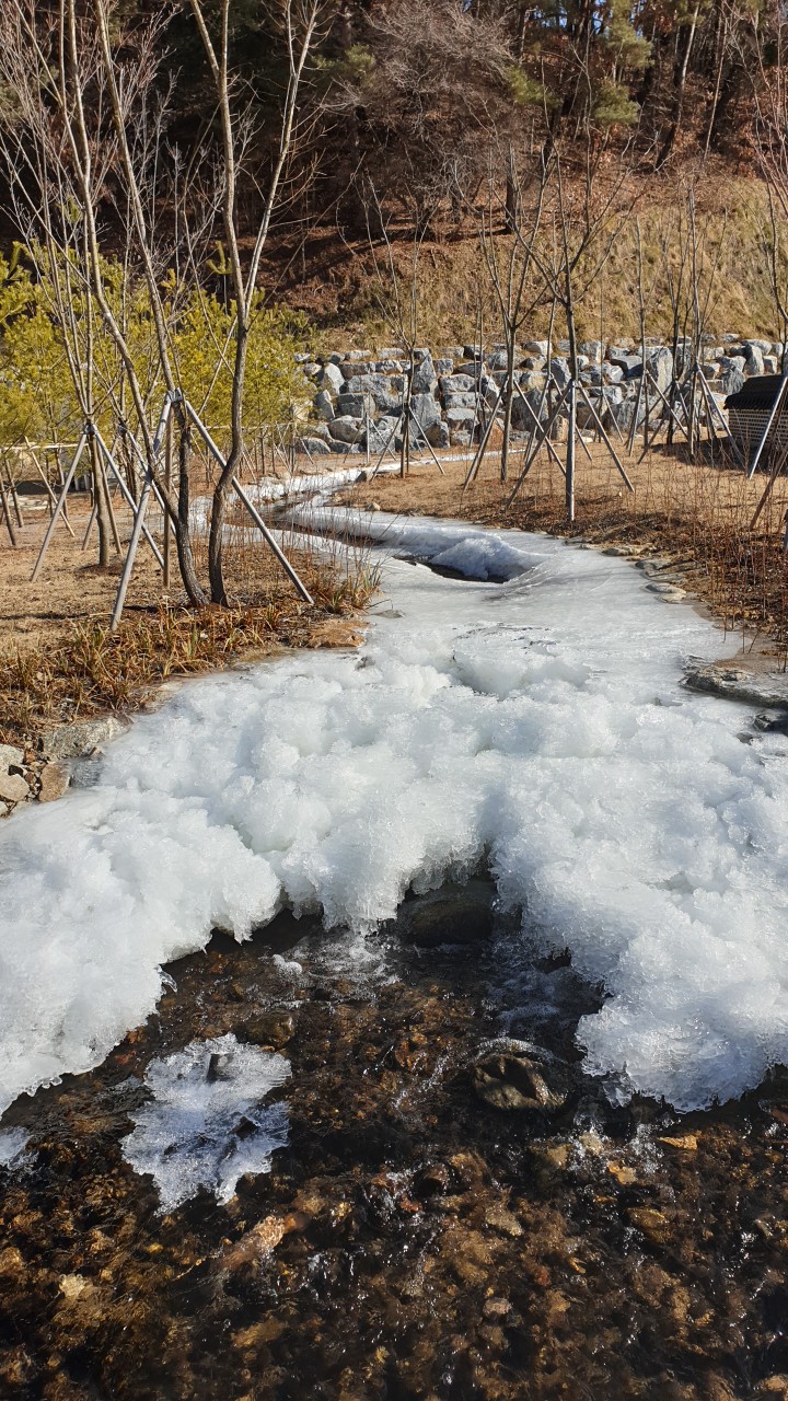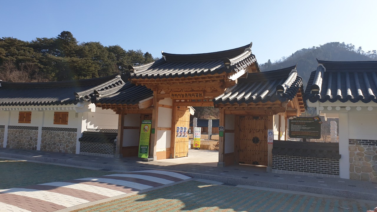 입구 지나 누런 잔디밭 십이지간 조각과 검정 기와 지붕을 이고 있는 관광홍보관, 체험동, 십장생 조각, 대청마루 휴게관, 민속촌, 인공 폭포, 얼음덮힌 개울...