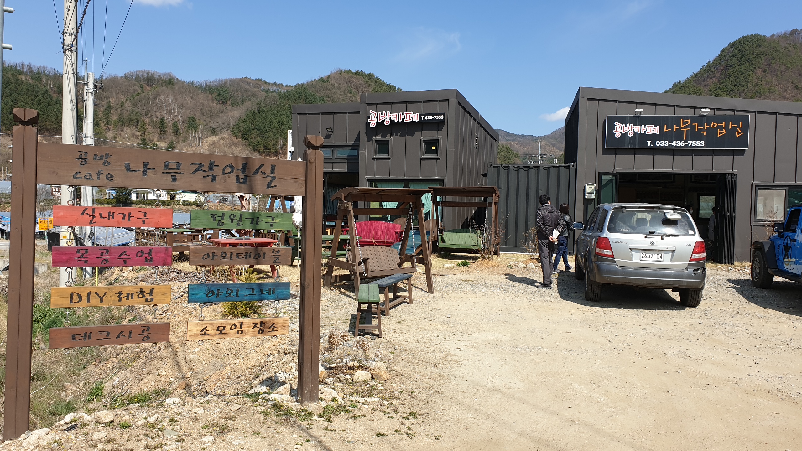 방문한 곳은 '공방까페 나무작업실'입니다. 홍천군 화촌면 장전평리에 위치하고 있습니다. 이곳에서 차를 마실 수 있는 까페와 목공을 배우고 작업을 할 수 있는 공간이 꾸며져 있습니다.