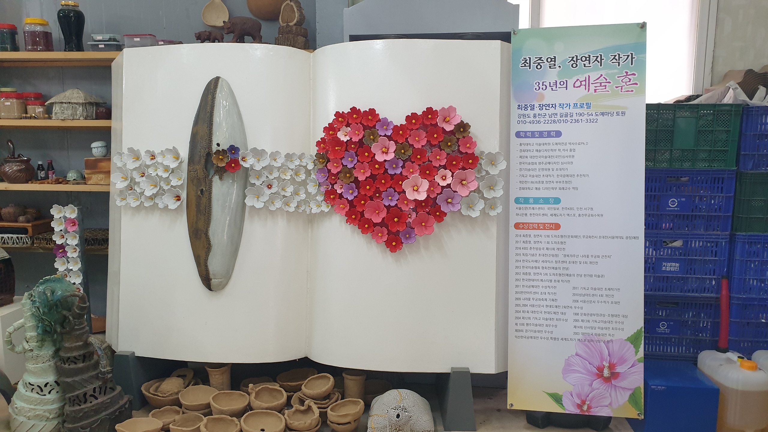 최중열, 장연자 작가 부부는 도시에서 잘나가는 문화예술활동, 사업들을 정리하고 15년전에 홍천으로 귀촌하셔서 지역 특성에 맞게 무궁화를 도자기로 작품 활동을 하고 계시는 분들입니다. 정확히는 모르겠지만 수만평되는 공간에 무궁화 도예 체험마당 및 조형작품 전시공간, 다양한 문화예술공간 등을 꾸미시는 꿈을 갖고 계시며 천천히 이뤄나가고 계십니다.