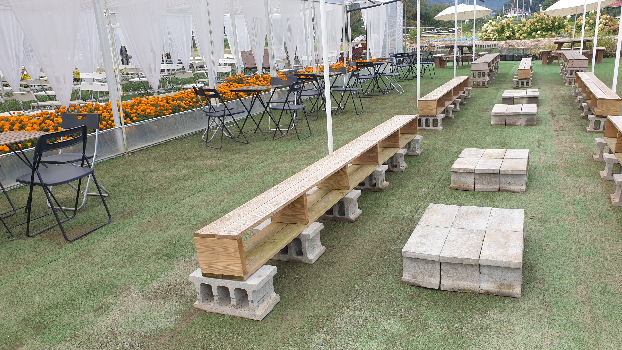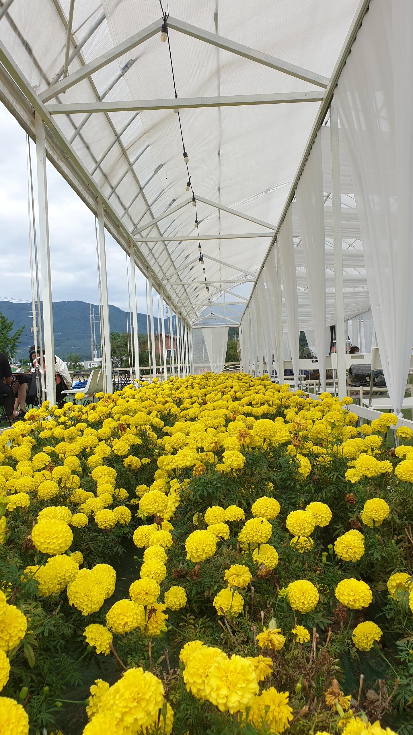 비닐하우스안에 피어있는 천일홍과 메리 골드, 국화가 환하게 반겨 줍니다.