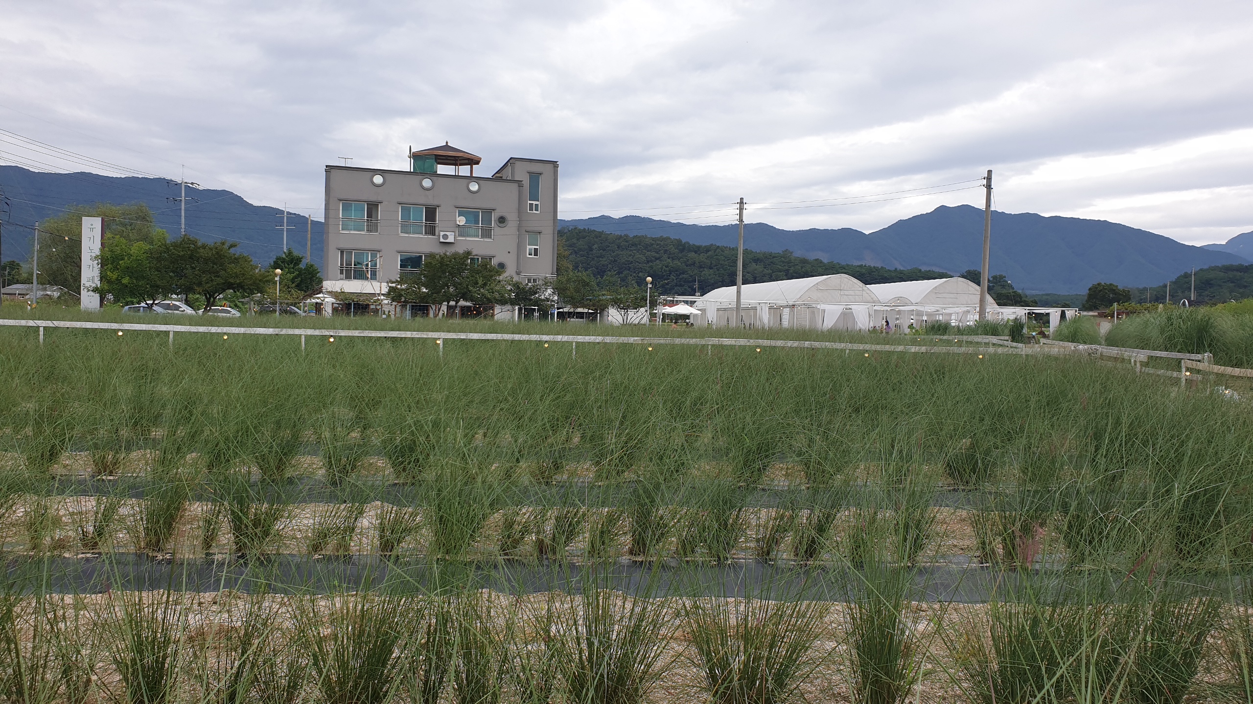 건물옆으로 비닐하우스가 처져 있고, 꽅들이 심겨져 있습니다.