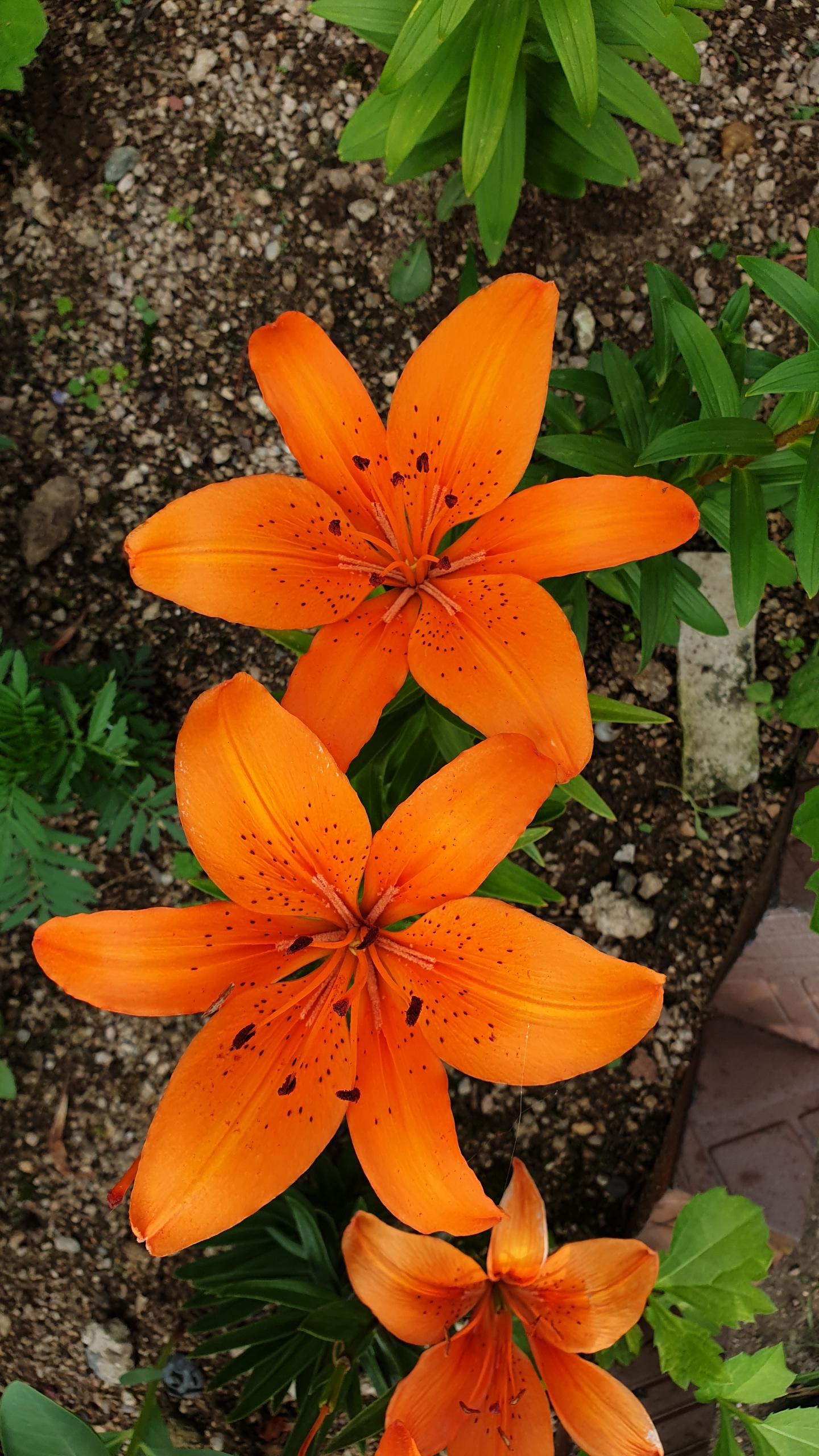 길지도 않는 줄기에서 하늘을 향해 노랗고, 주황색 나리꽃의 여섯 꽃잎이 펼쳐졌습니다.