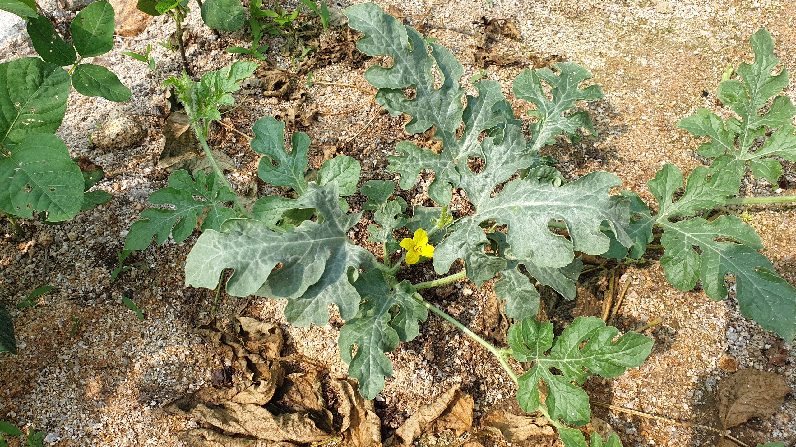 봄에 나무시장 갔다가 덤으로 수박 모종을 얻어와 밭 언저리에 심었습니다.