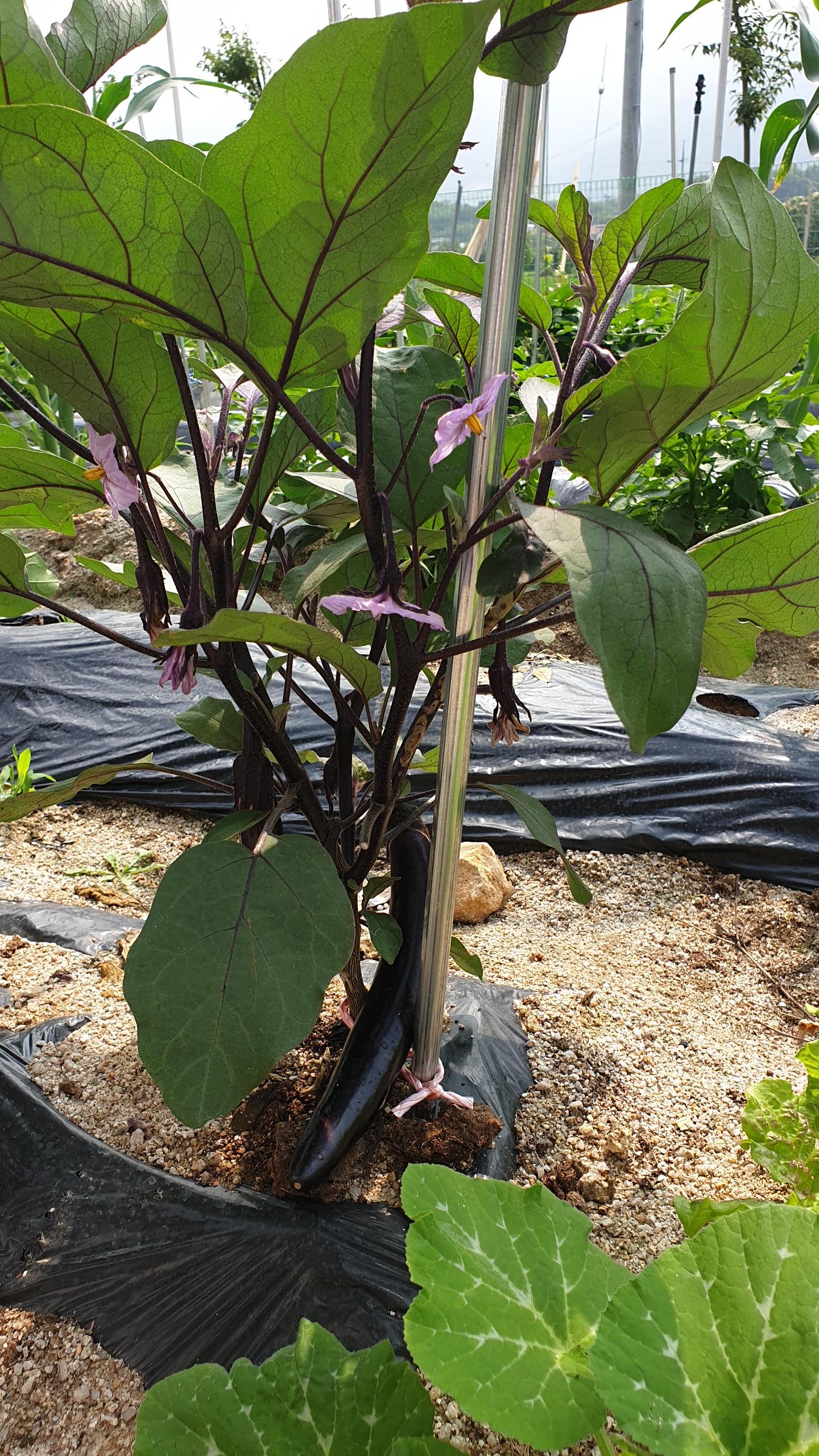 며칠전 보랏빛을 띤 가지꽃이 피더니 그 밑으로 가지가 달렸습니다.