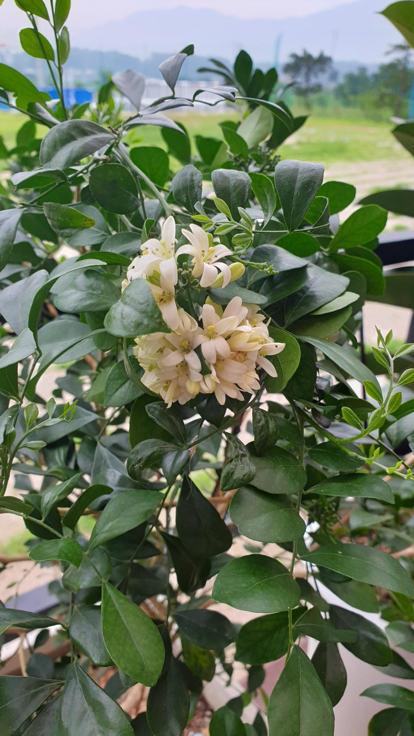 며칠전부터 꽃망울이 맺히더니 하얗기도 크림색 같기도 한 오렌지 쟈스민 꽃이 피었습니다.