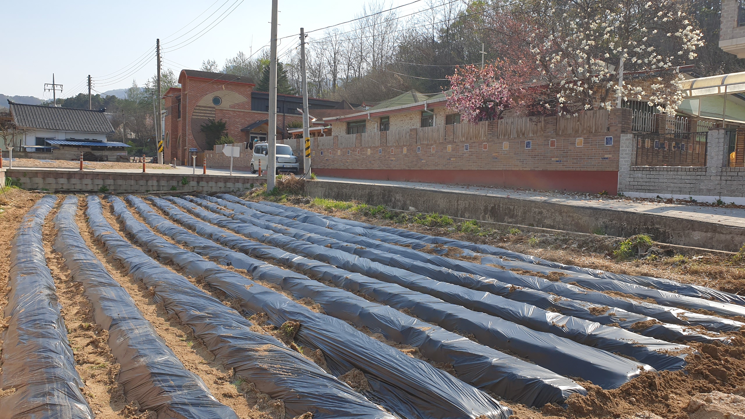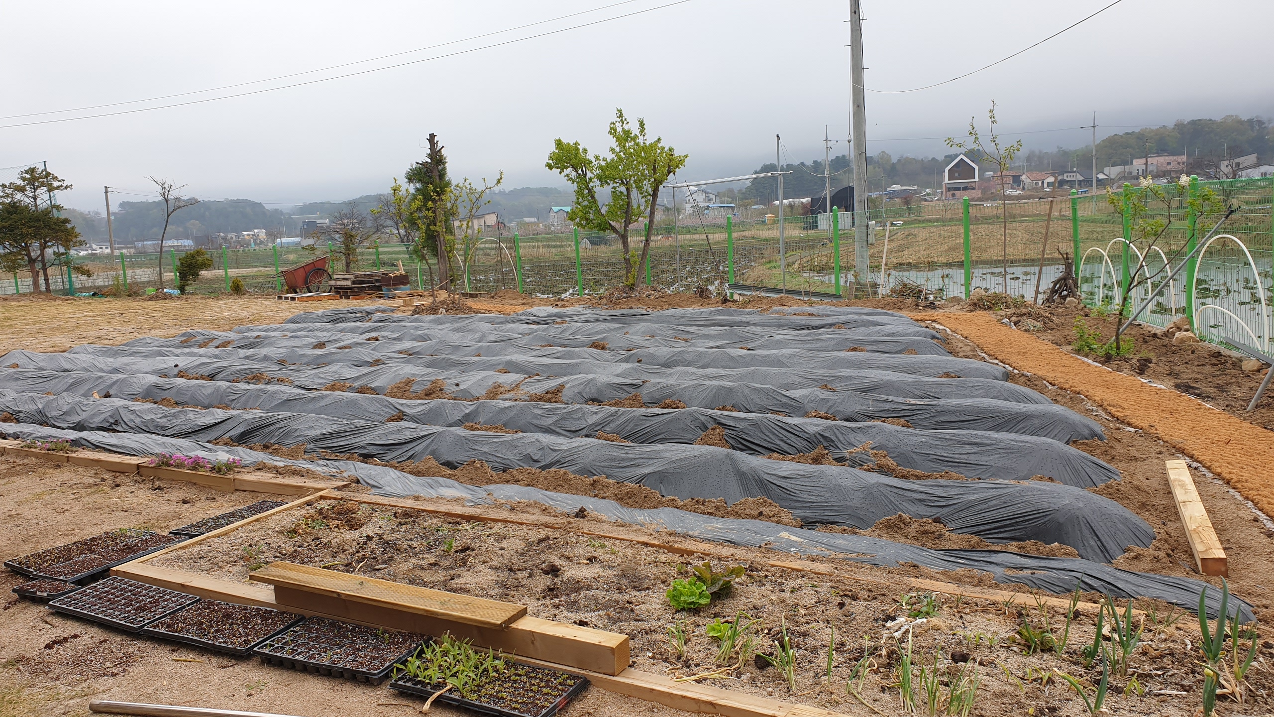 2년전에 설립했던 사암마을협동조합 몇 구성원 가족들과 함께 크지 않지만 집 앞쪽에 있는 60여평되는 밭을 빌렸습니다. 마을 이장님께 부탁하여 로타리치고 고랑을 만들었습니다. 며칠전에 구성원들과 함께 까만 비닐을 씌었습니다. 거의다 텃밭을 처음 가꾸는 분들입니다. 1년 먼저 밭을 갈아 본 제가 감히 이것저것 알려주며 텃밭의 꿈을 함께 심었습니다. ㅎㅎ