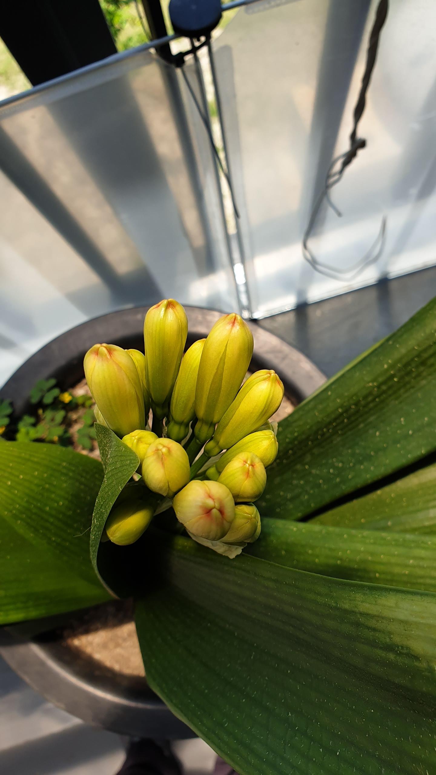 어느날 꽃대가 툭 위로 나오더니 하얀 꽃몽우리가 생겼습니다. 군자란을 그동안 본 적이 없어 하얀색 꽃이 나오나 싶었습니다. 그런데.. 몽우리 끝쪽이 약간 주황색을 띄더니 그 속에서 붉으스런 여러 송이가 비집고 나옵니다.