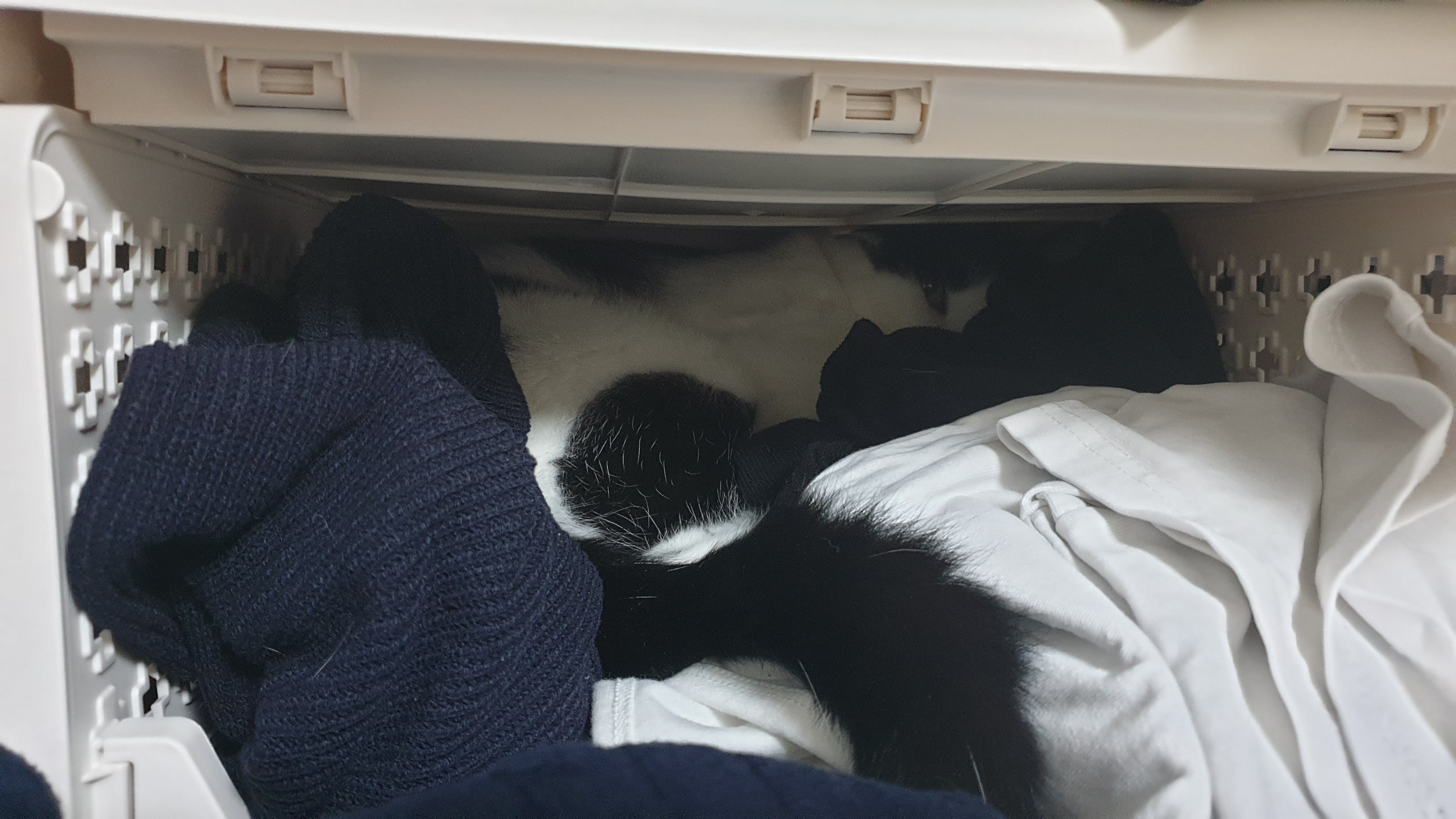 우리 콩떡이는 새벽까지 혼자 이리뛰고 저리뛰고 난리를 치더니 아침해가 떠오르면 슬며시 딸내미 옷장속 플라스틱통안으로 비집고 들어가 잠을 자려 준비하네요. 이방 저방 휘집고 다니는 콩떡이의 털이 온데마다 흔적으로 달라붙어 있네요.