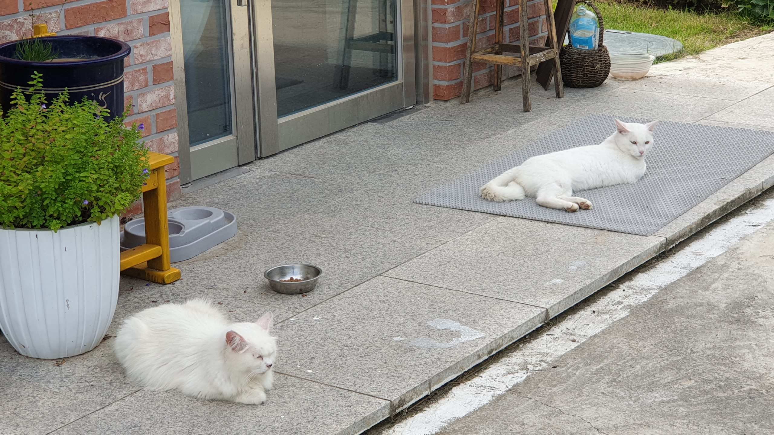 오월이와 나옹이는 밥그릇을 따로 마련해줍니다. 처음에 한 그릇에 먹이를 줬더니 오월이가 먹고 있는데 나옹이가 함께 먹으려 했더니 하악질을 하면서 앞발로 따귀를 갈기는 모습을 보면서 먹이그릇을 따로 마련했습니다. 아니면 오월이가 식사가 끝나야만 나옹이가 그 뒤로 남은 먹이를 먹습니다. 철저한 장유유서를 따지는 모습이네요.