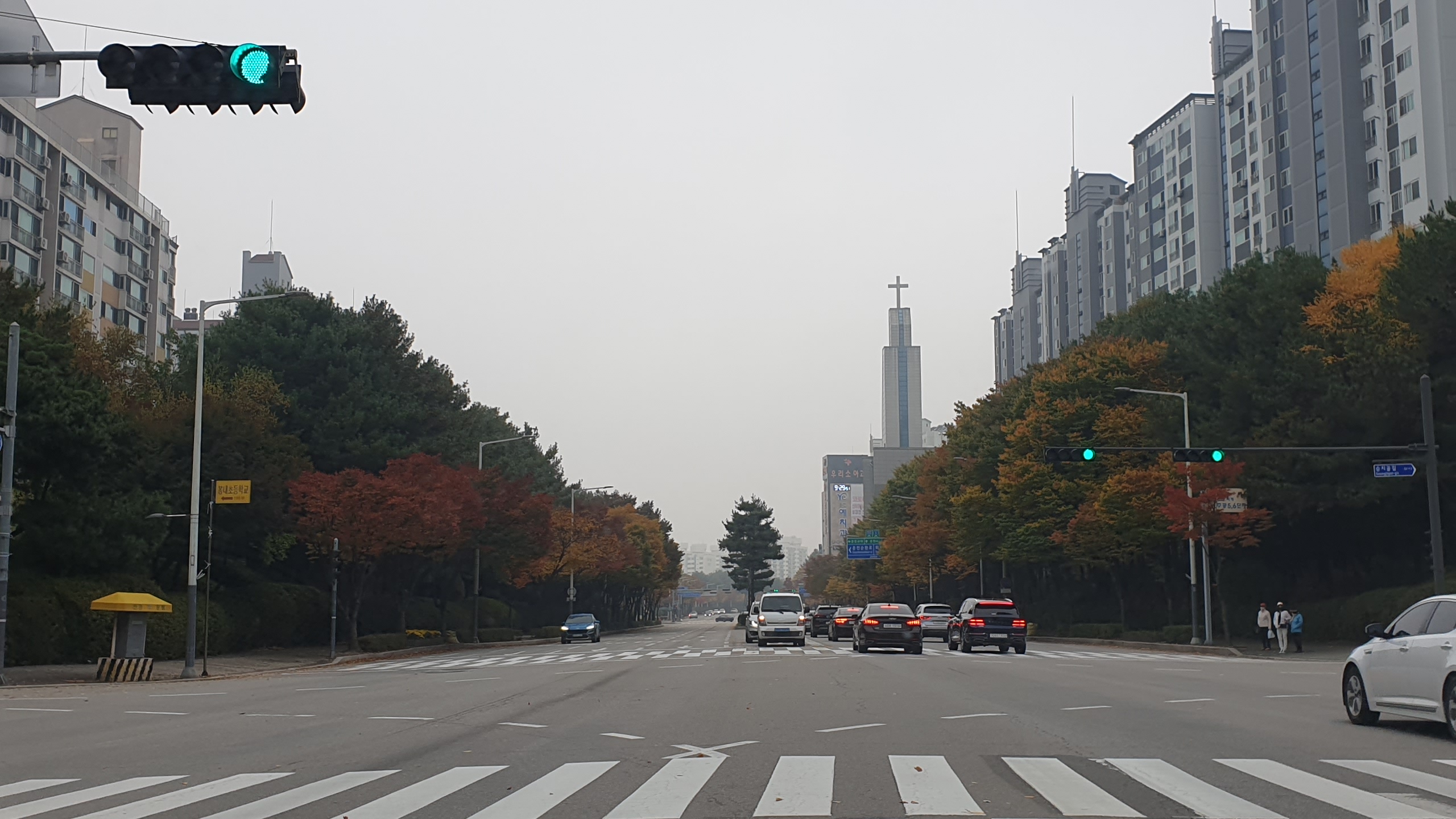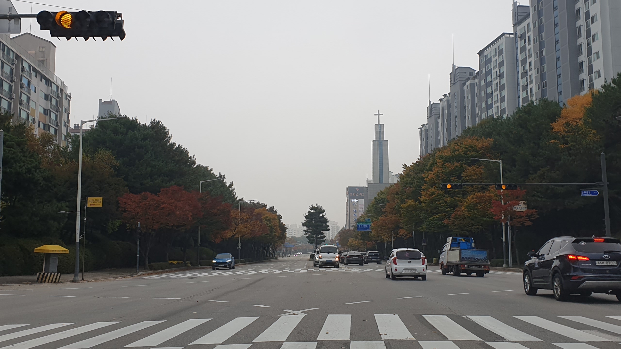 차로 주행하다가 도로 가로질러 빨강 신호등앞에 섰습니다.