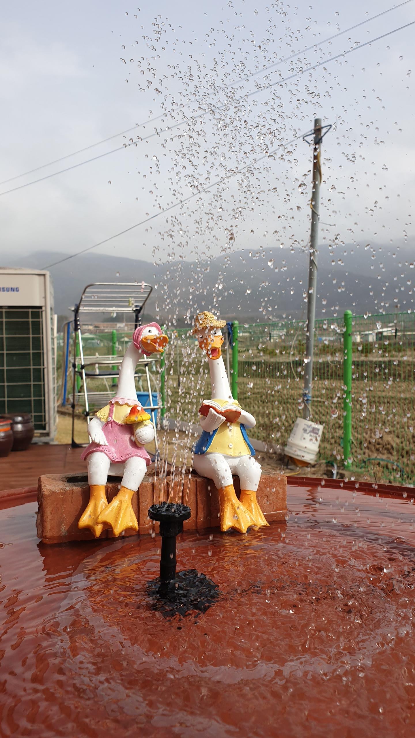 바깥 데크에 대야를 놓고 작은 분수대를 만들었습니다.