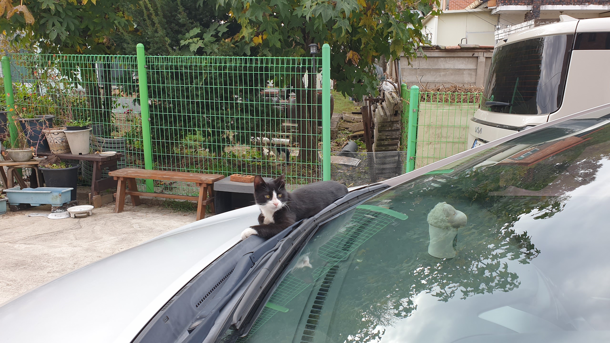 낮에 햇빛이 따사로우니 나옹이와 반달이가 차위에 올라 일광욕을 하고 있네요.